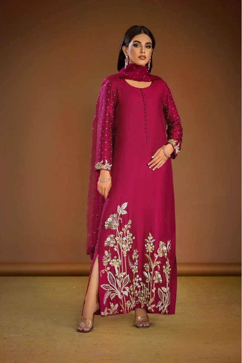 These gorgeous, deep purple colored silk ensembles that will surely make you stand out from the crowd. This ensemble is meticulously worked with a hand embellished neckline . Donned throughout with pearls, cut dana, tilla , shirt is finished with a worked scallop border. Paired with matching raw silk trouser and pure organza dupatta is the most chic polished vibe that makes this ensemble just perfect.